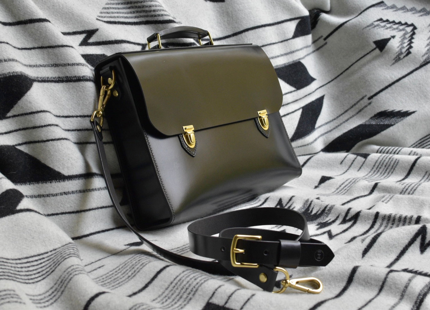 A one piece minimalist shoulder bag with top handle & tuck lock closure. Made with over one thousand hand stitches & solid brass hardware, this bag is made for both the office & the weekend.